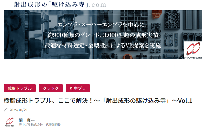 府中プラ株式会社が執筆した技術コラムが、長瀬産業株式会社の技術情報サイト「plaplat」にて連載企画として掲載されることとなりました。2025年10月29日に第一回「樹脂成形トラブル、ここで解決!~『射出成形の駆け込み寺』~Vol.1」が公開されております。